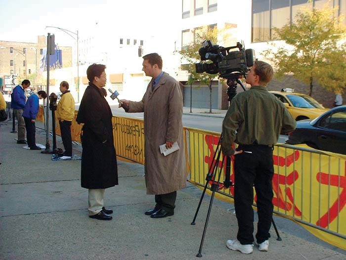 法轮功学员2002年10月在芝加哥中国驻美国大使馆前为法轮功和平请愿