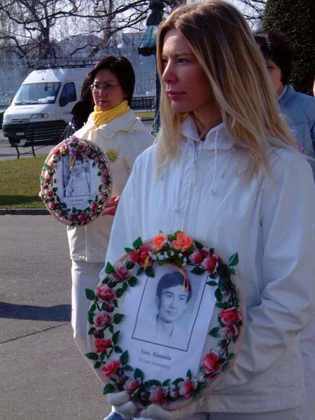 2003年3月法轮功学员在日内瓦59届联合国人权年会举行活动,要求停止迫害法轮功