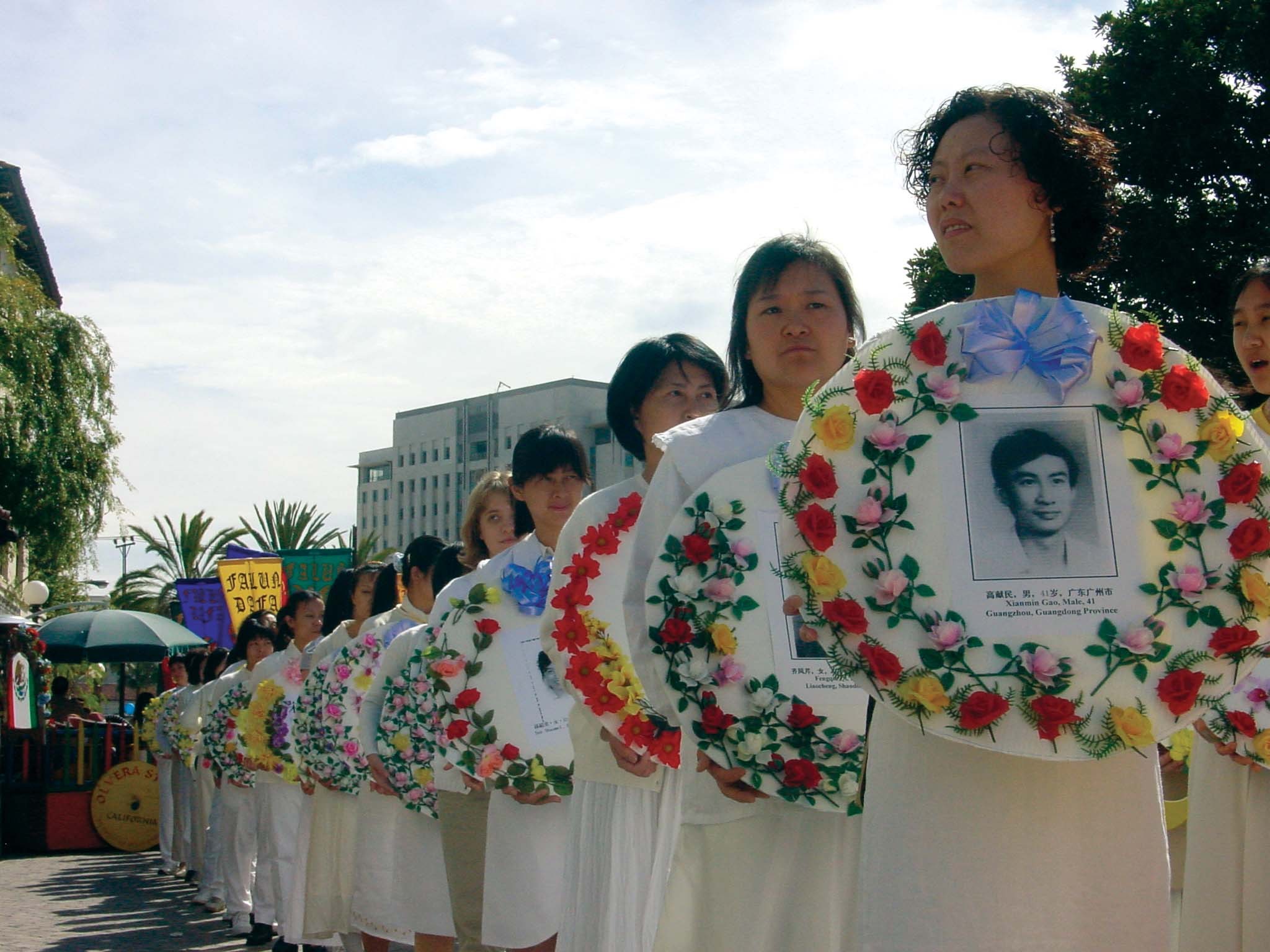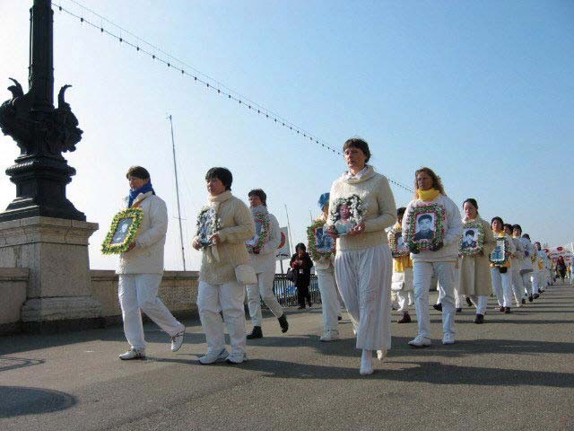 法轮功学员手捧被迫害致死的法轮功学员的照片游行