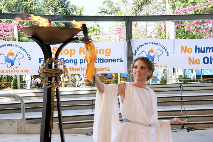 澳洲布里斯本点燃人权圣火,法轮功受迫害问题受瞩目图为装扮希腊女神接下火炬2007-11-3