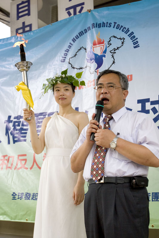 “人权圣火”抵达台北县,各界出席承接图为评论家林保华2008-6-15