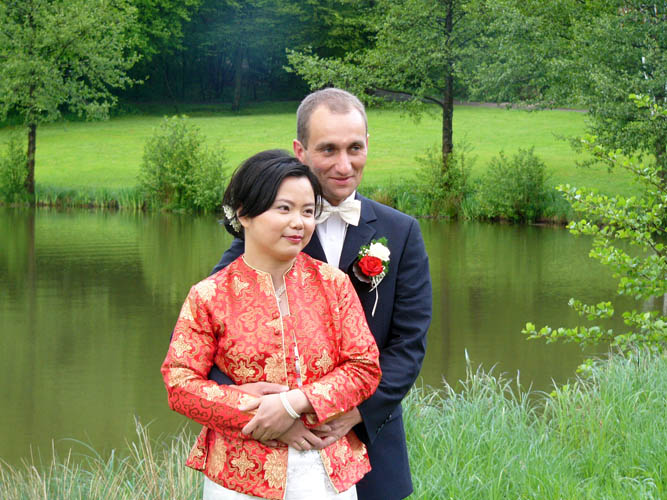 德国法轮功学员米歇尔和妻子在碧水蓝天之下拍下结婚照