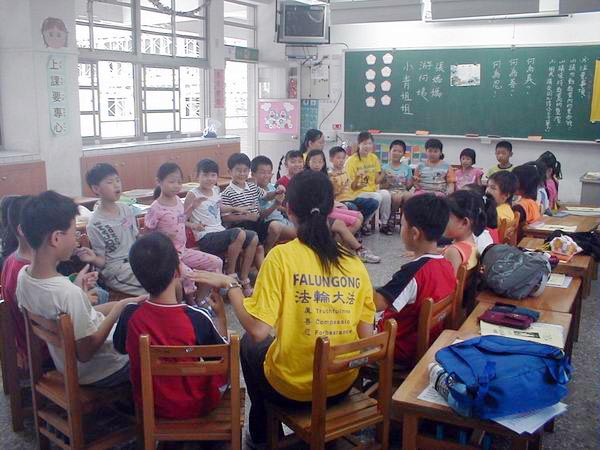 花莲法轮功学员李敏瑜老师在明义国小成立了明慧组,图为小朋友一齐学法.