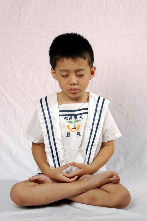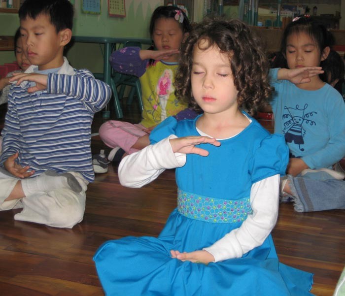 台北明慧学校精進班的小弟子们在学炼第五套功法──神通加持法 2006-8