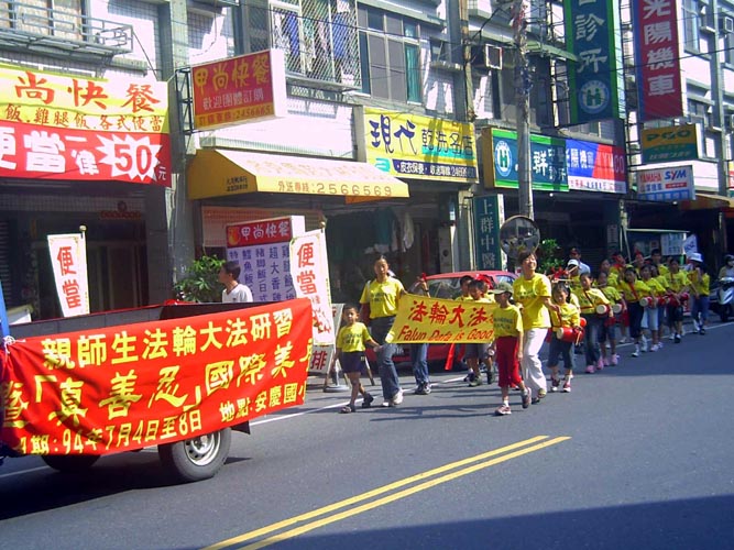 法轮大法洪传台湾中坜—图为明慧学校小弟子参加2004年法轮大法日游行