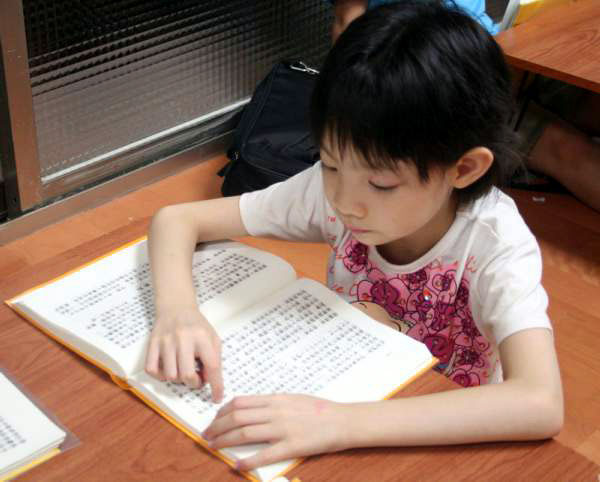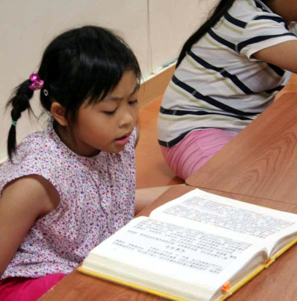明慧学校的大法小弟子参加嘉义东石高中举办的活动图为六岁纹玉学法时很专心2008-10-5