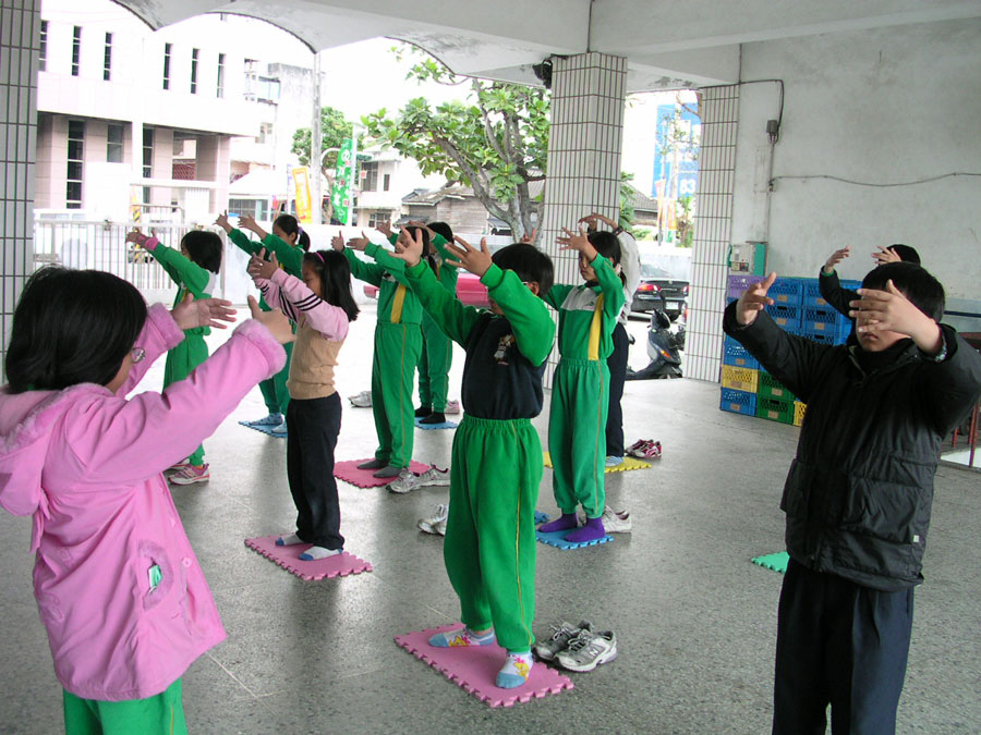 花莲法轮功学员李敏瑜老师在明义国小成立了明慧组,图为小朋友认真的炼五套功法.