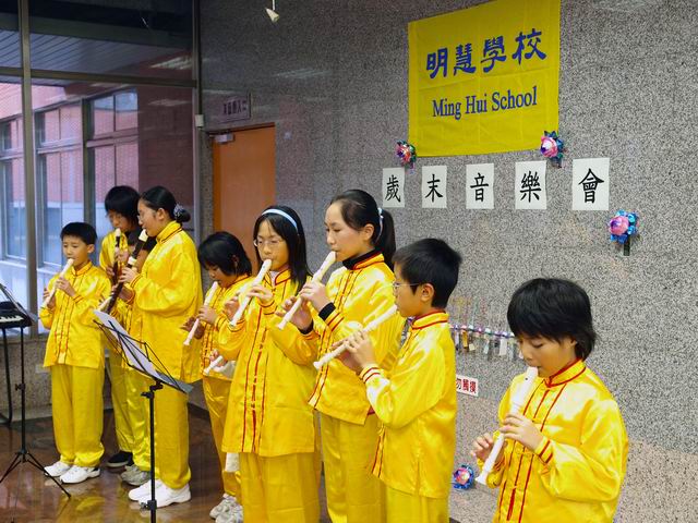 台湾明慧学校在桃园县平镇市社教馆举办了一场“岁末音乐会”图为小弟子的直笛演奏2008-2-2