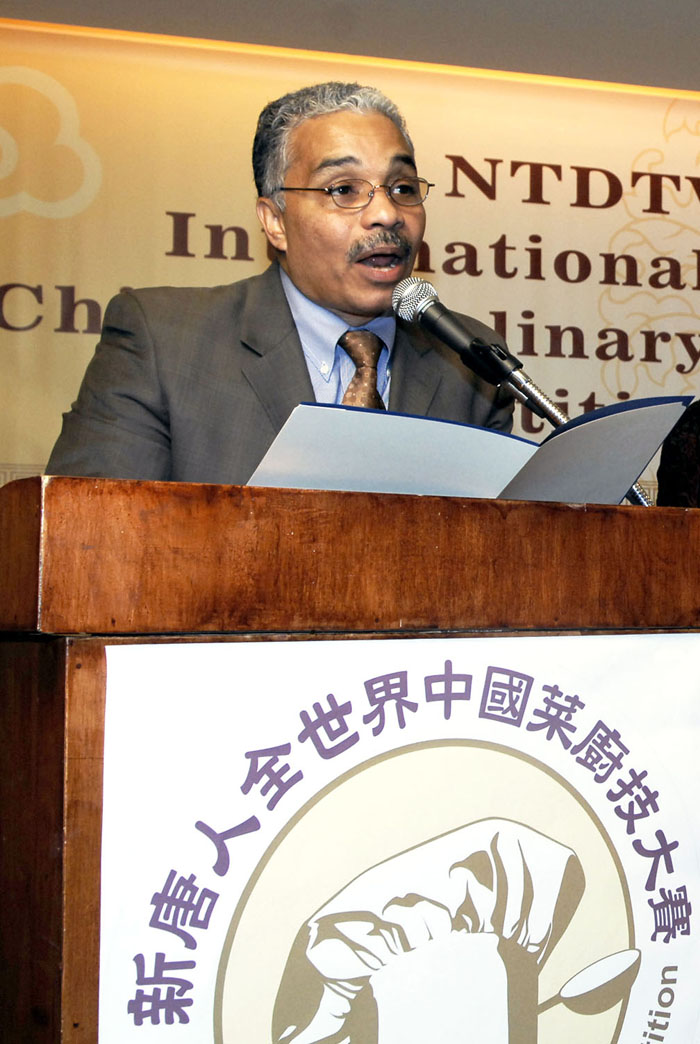“全世界中国菜厨技大赛”大赛颁奖纽约州长致贺图为纽约州务卿顾问Ricardo Aguirre发言2008-11-19