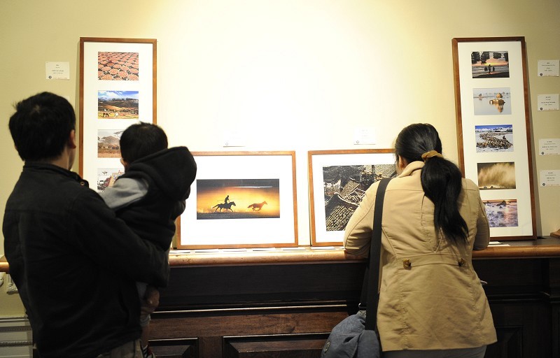 观众在欣赏新唐人首届「全球华人摄影大赛」优秀作品展。