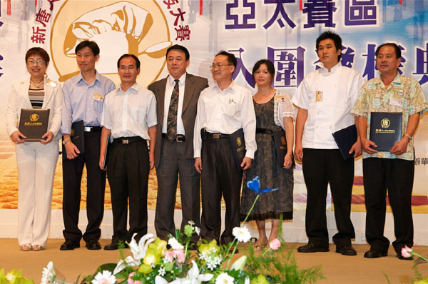 “全世界中国菜厨技大赛”在高雄餐旅学院举办亚太区初赛图为入围者与学院校长容继业合影2008-9-20至21