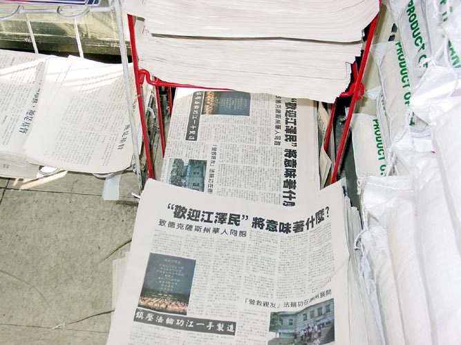 德国戈斯拉报2002年4月12日以“中国热正在蔓延——今天江来了”为题目刊载文章,描述江泽民到德国戈斯拉市的当天,该市民众怨声载.图为道路上的井盖被焊死