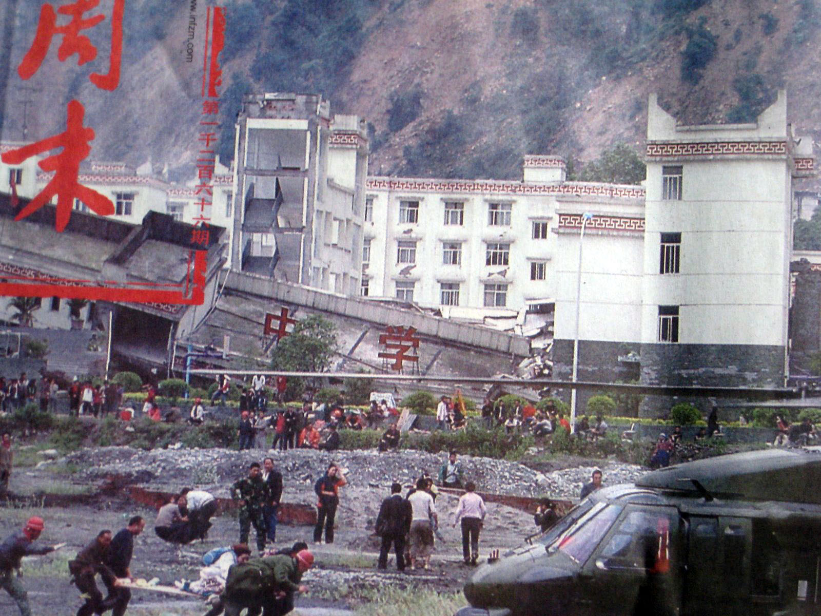 汶川地震窥析:图为倒塌的中学后面露出了坚固豪华的办公楼