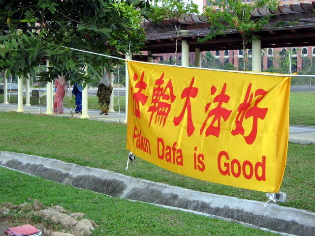 韩国法轮功学员在中领馆前遭袭击肇事者被拘捕判罪,图为被肇事者撕毁的横幅2006-6-26