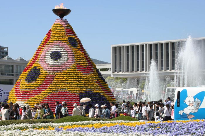 日本法轮功学员参加第30届广岛鲜花节讲真相 图为广岛和平公园的花塔2006-5