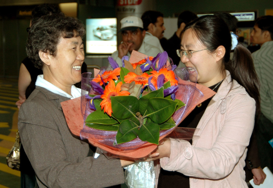 八位联合国庇护的法轮功学员从泰国飞抵新西兰,图为张瀚文(左)和女儿和彦辰(右)团聚