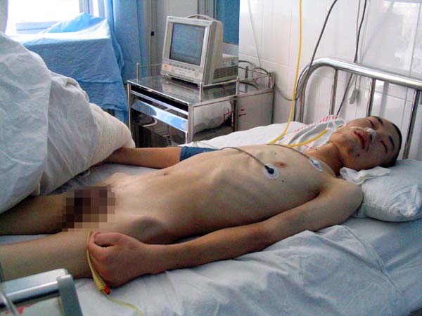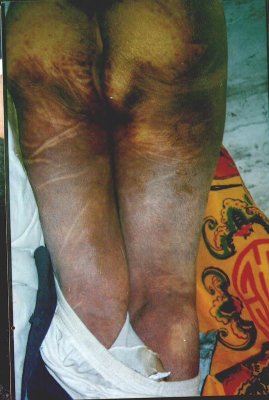 唐山伤残人赵英奇因修炼法轮功被劳教所折磨死亡,图为伤痕累累的遗体