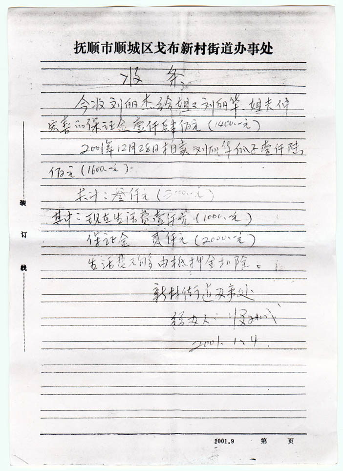 四张收条见证抚顺恶警贪钱:害死大法弟子仲宏喜后非法监禁其家人并将家产洗劫一空