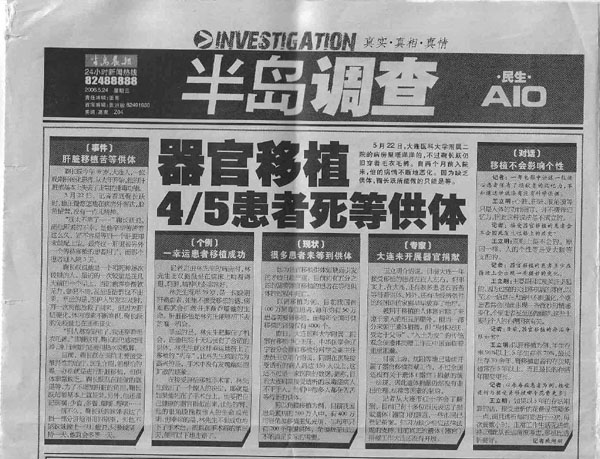 调查线索:大连医科大学附属二院3到10天便得到肝供体,图为大连《半岛晨报》5月24日报道