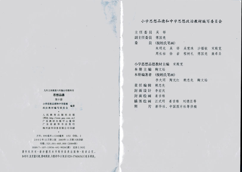甘肃部份学校使用毒害学生的课本,图为《思想品德》(七年级上册)出版单位、主编