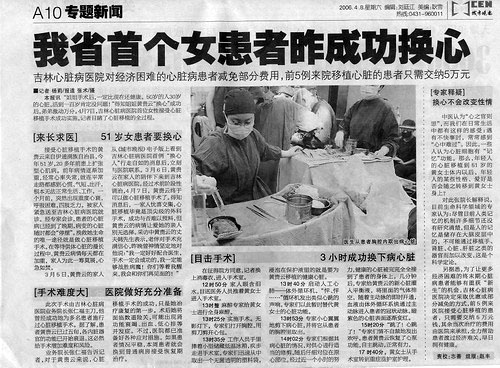 2006年4月8日长春《城市晚报》报导:吉林心脏病医院(供体来源可疑)又成功完成了一例心脏移植手术。
