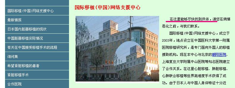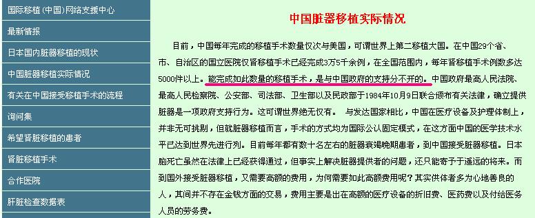 沈阳移植中心的中文网页,红线字为能完成如此数量的移植手术,是与中共政权的支持分不开的