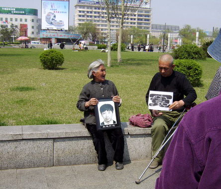 吉林市大法弟子王建国,仅40天被迫害致死, 王建国的奶奶手捧“遗像”和一个大“冤”字向路人诉冤情