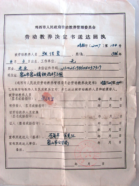 黑龙江密山市张传富、薛颜荣被非法劳教的内幕图为非法劳动教养决定书