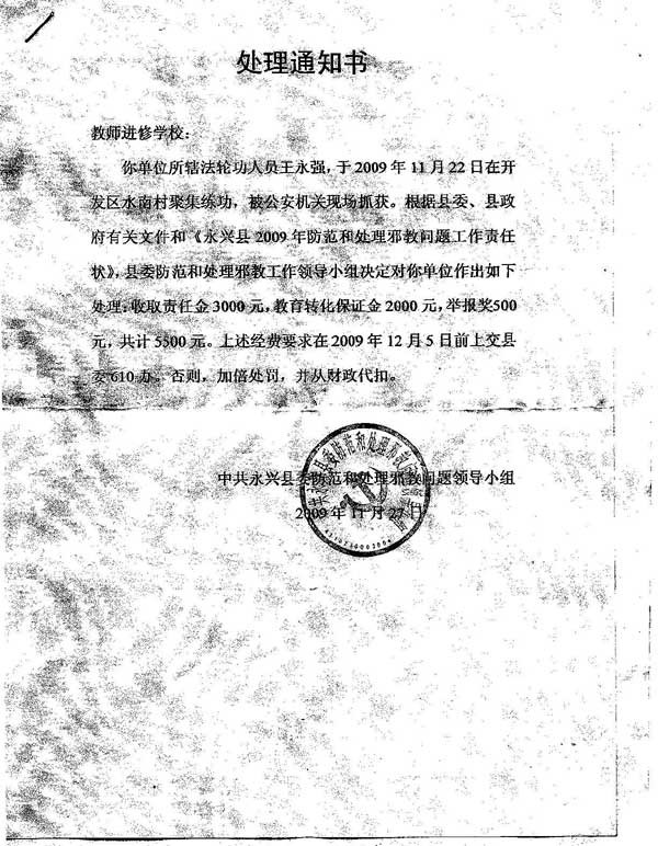 冠县政府停发二十九名大法学员工资的通知