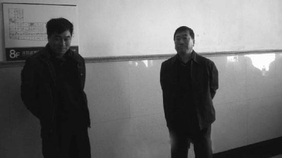 被非法绑架的大法弟子周惠芳的丈夫穿着写有“打倒中共,自由万岁”的背心到公安局要人