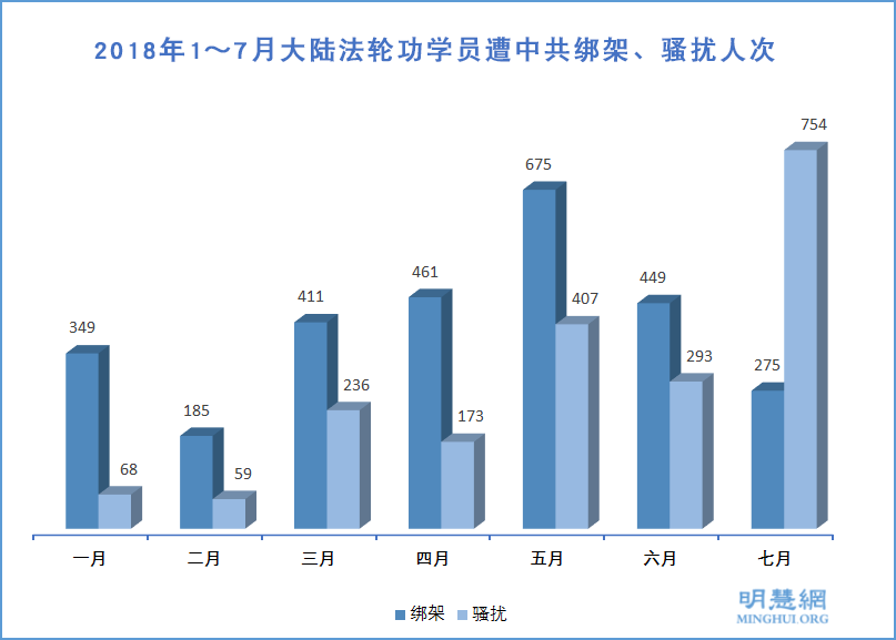 2018年4848名法轮功学员被非法抓捕 图为绑架、骚扰人次按月统计
