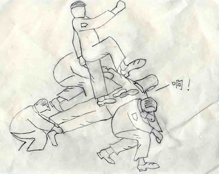 沈阳龙山教养院酷刑图示:蒙被定位。双臂被拧在后面举高、掰腿别脚(膝盖向外掰,脚向里掰),用毛巾将口鼻堵上,阻止出声和呼吸,抓住头撞水泥地,然后将头部窝進大腿根部位,脸贴到水泥地上。又用被子捂上