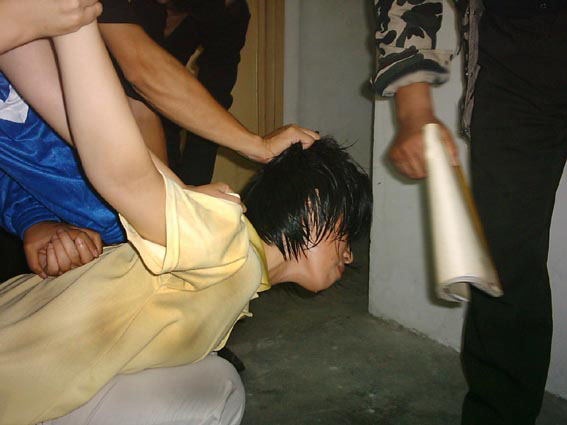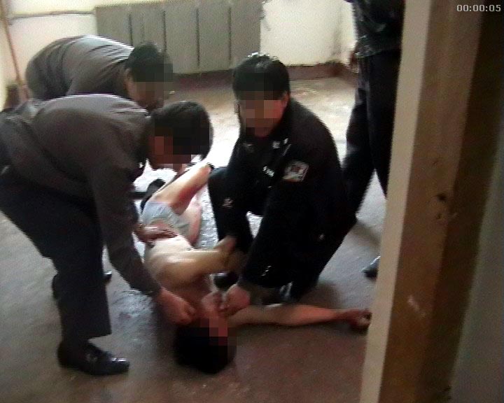 沈阳马三家教养院酷刑演示---图1-2:队长黄海燕猛揪住石胜英的头发把她从地上拖起,“咣、咣”不停的撞水泥墙。