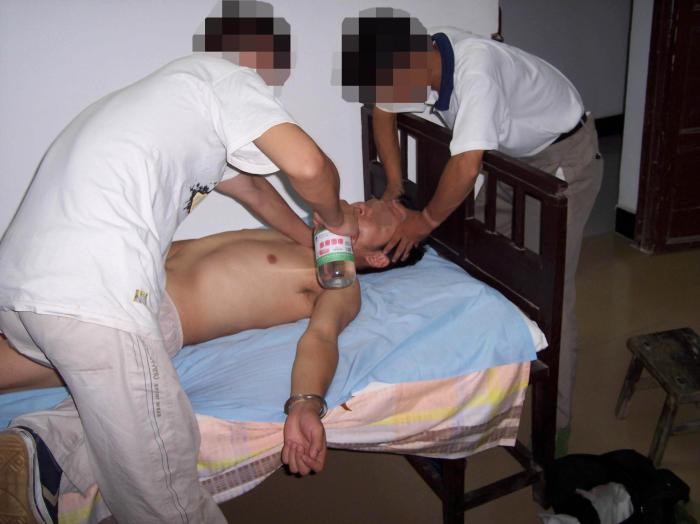 湖北大法弟子廖元华在范家台监狱所受酷刑示范: 往廖元华的口中灌酒精,廖元华嘴不张开,他们就从鼻孔往下灌酒精