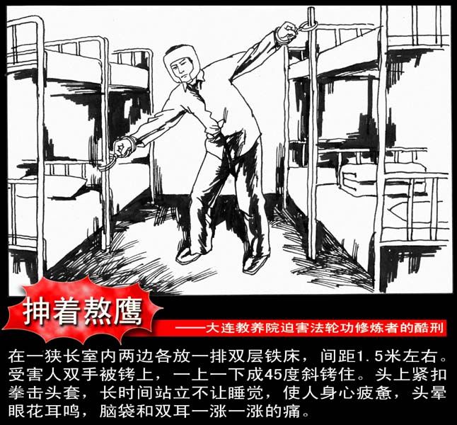 图片:大连教养院迫害法轮功修炼者的酷刑---抻着熬鹰
