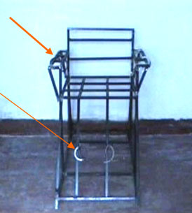 大连教养院女子大队禁闭室---后背绑上木椅子背,绳子穿过两腿间,和椅子背固定, 将人倚笼子一面升起并固定在笼子上,双臂展开,双手腕固定在笼子管上,双脚脚尖离地。