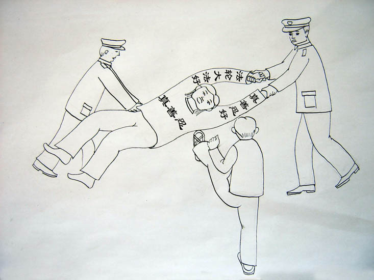 大连市非法关押场所的酷刑示意图-下扯大法弟子衣服。