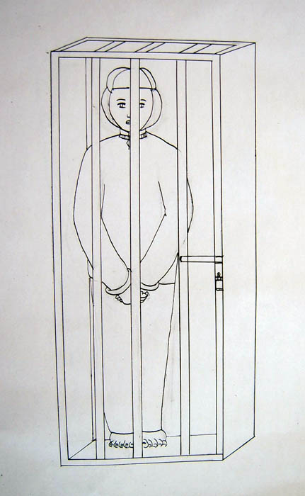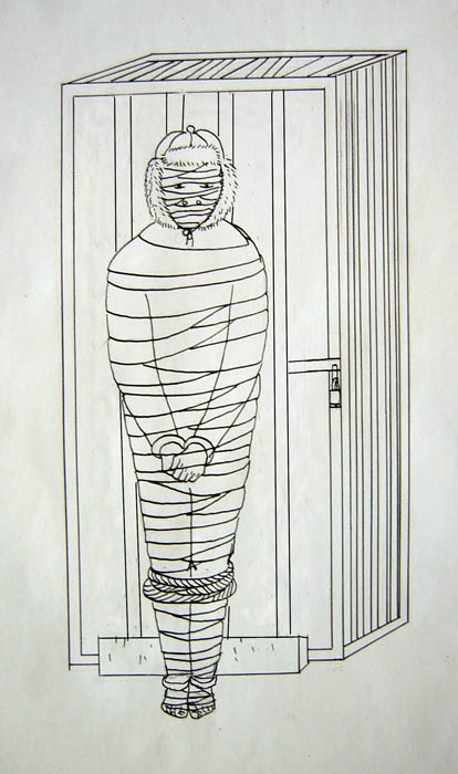 大连市非法关押场所的酷刑示意图--被绑在小笼子外面