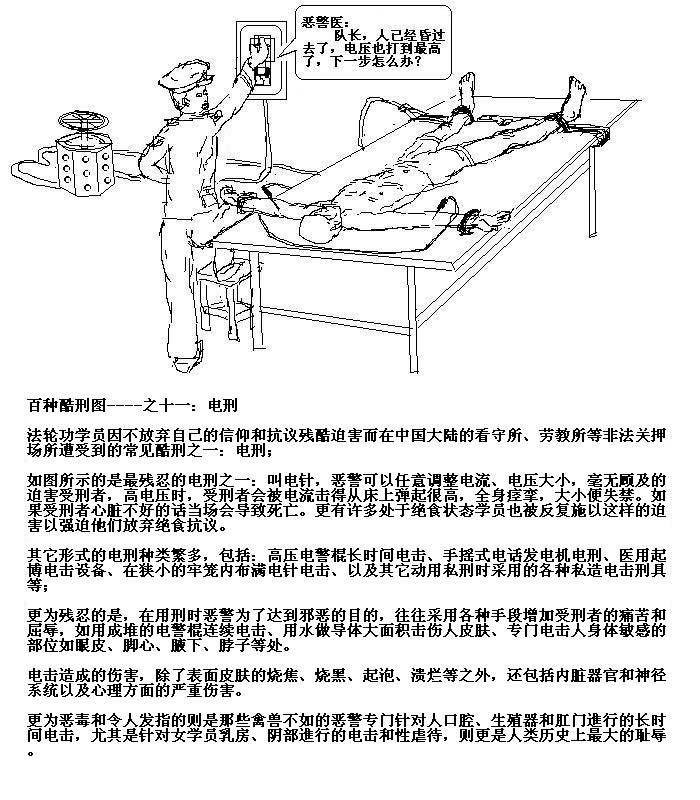 沈阳市法轮功學員张秀芳遭酷刑迫害精神失常。图為电击酷刑演示图。