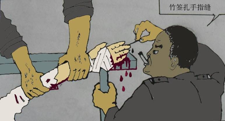 残酷迫害,酷刑图为酷刑演示:筷子钻指缝