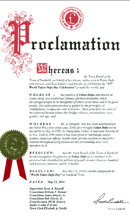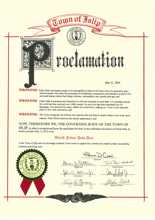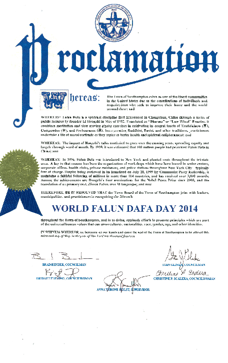 纽约市议员和区镇也颁发褒奖祝贺“世界法轮大法日”