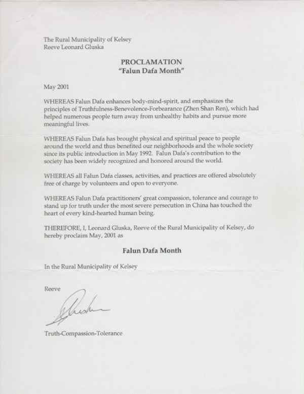 加拿大马尼托巴省凯西镇宣布宣布"法轮大法月"