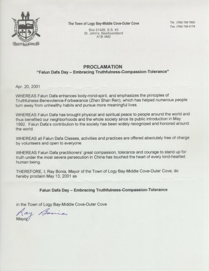 加拿大纽芬兰省洛继海湾中湾外湾镇宣布“法轮大法真善忍日”