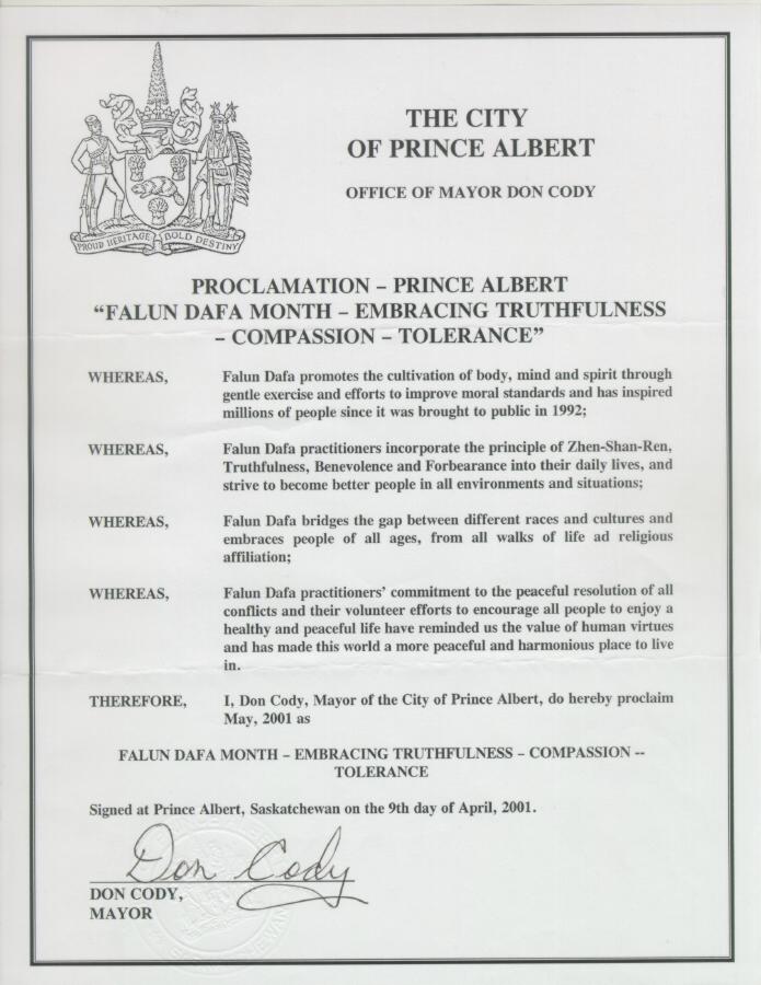 加拿大萨斯喀彻温省阿尔伯特王子市宣布“法轮大法真善忍月”