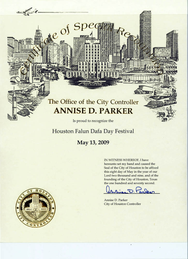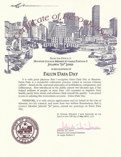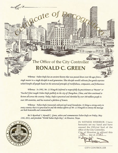 美国休斯敦市政府主计长贺“世界法轮大法日”
