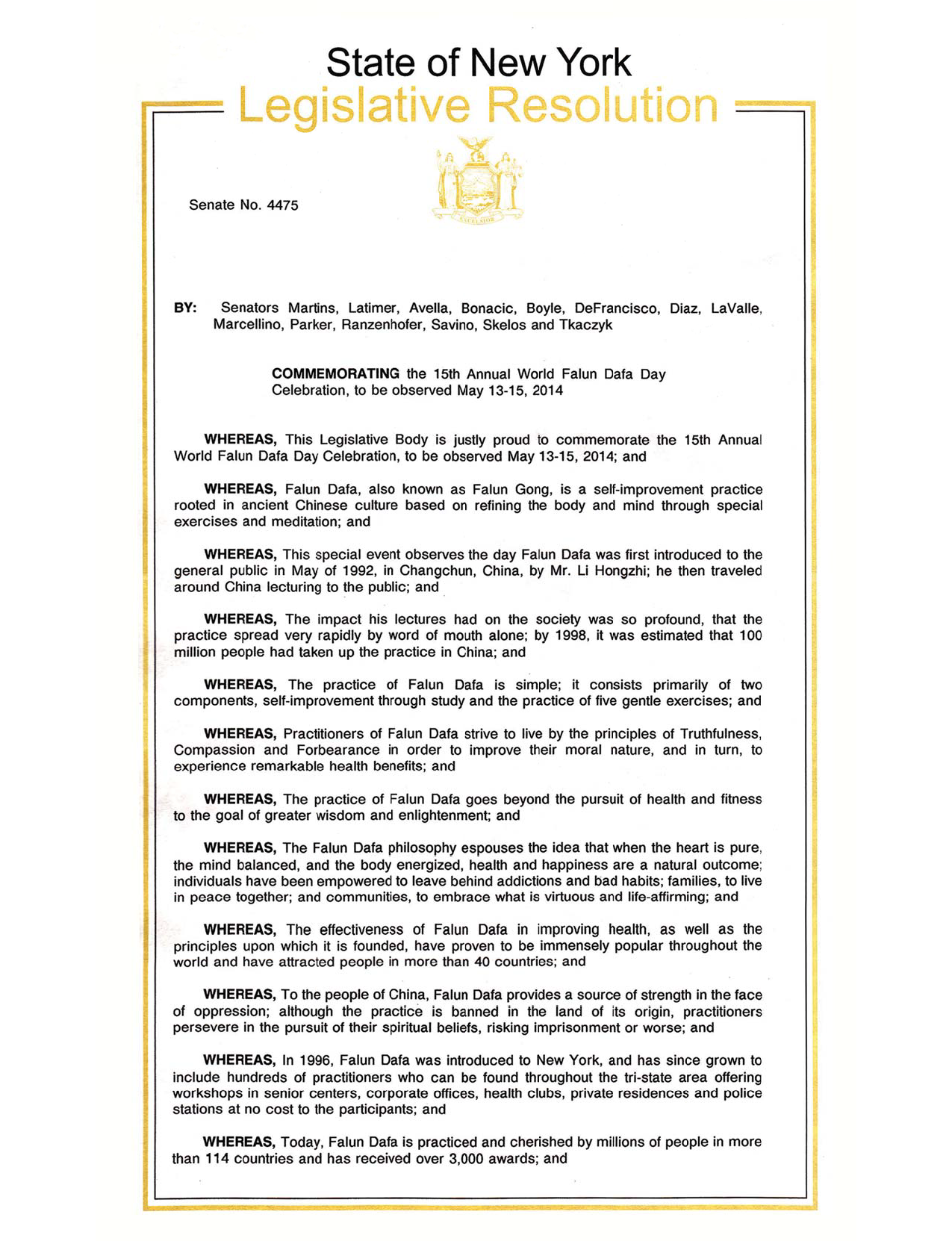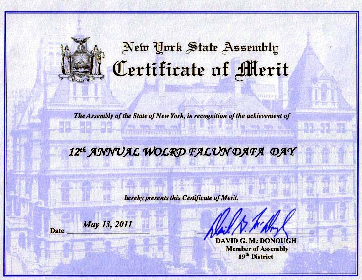 纽约州议员本德图褒奖法轮功图为褒奖证书