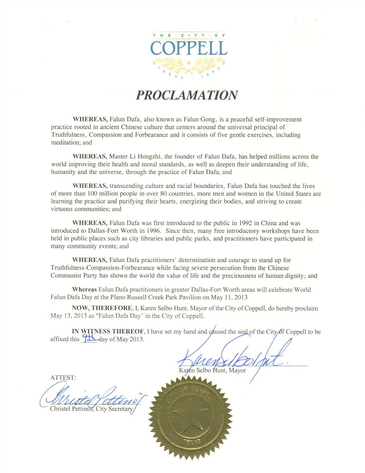 美国新墨西哥州拉斯克鲁斯市褒奖“法轮大法日”图为褒奖证书