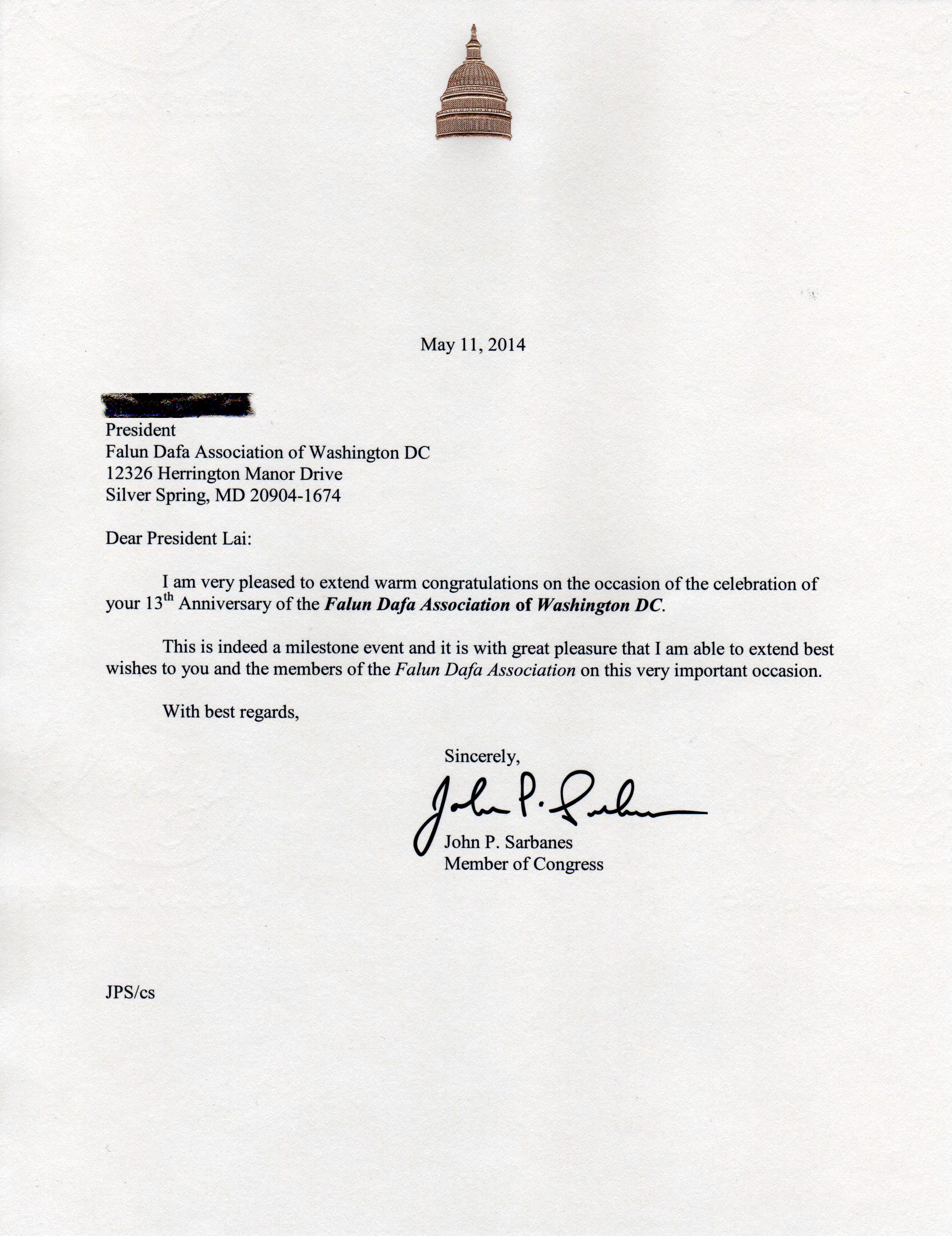 马里兰州联邦参议员米库斯基祝贺法轮大法弘传二十二周年
