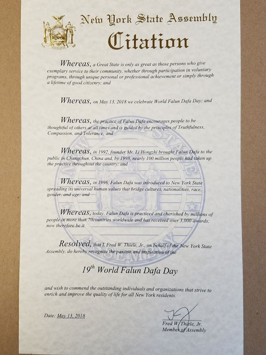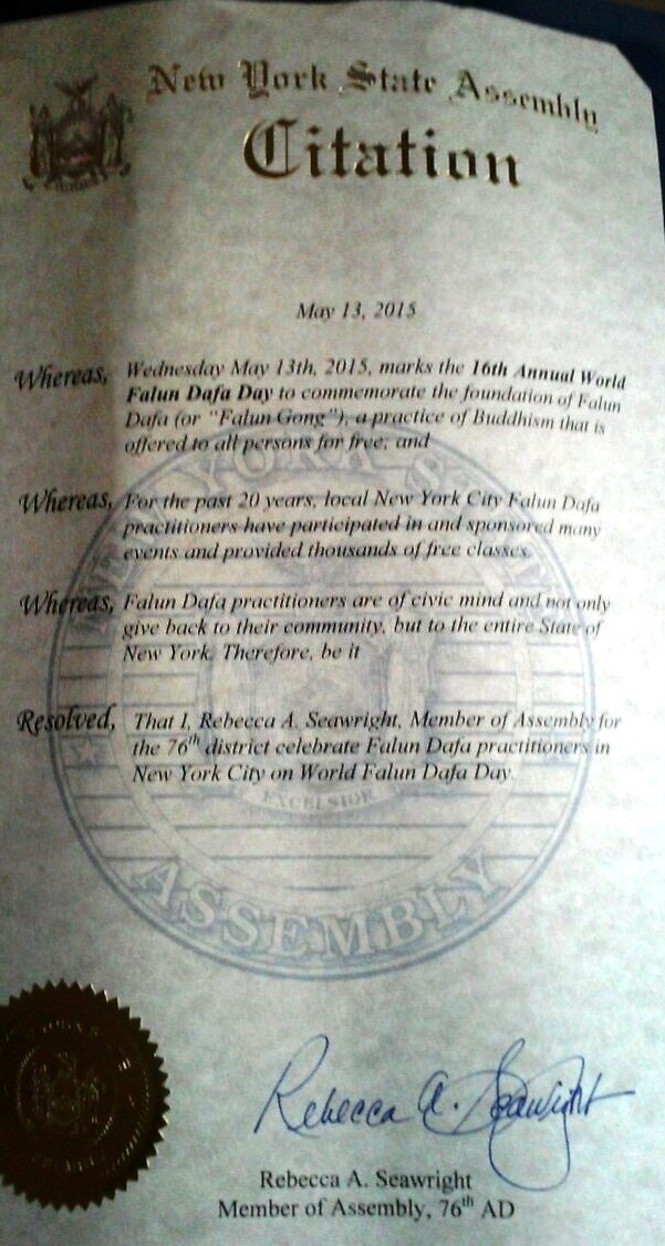 纽约州议员恩格布莱特褒奖世界法轮大法日图为褒奖证书