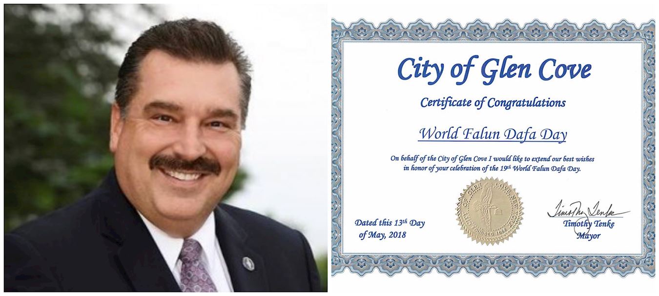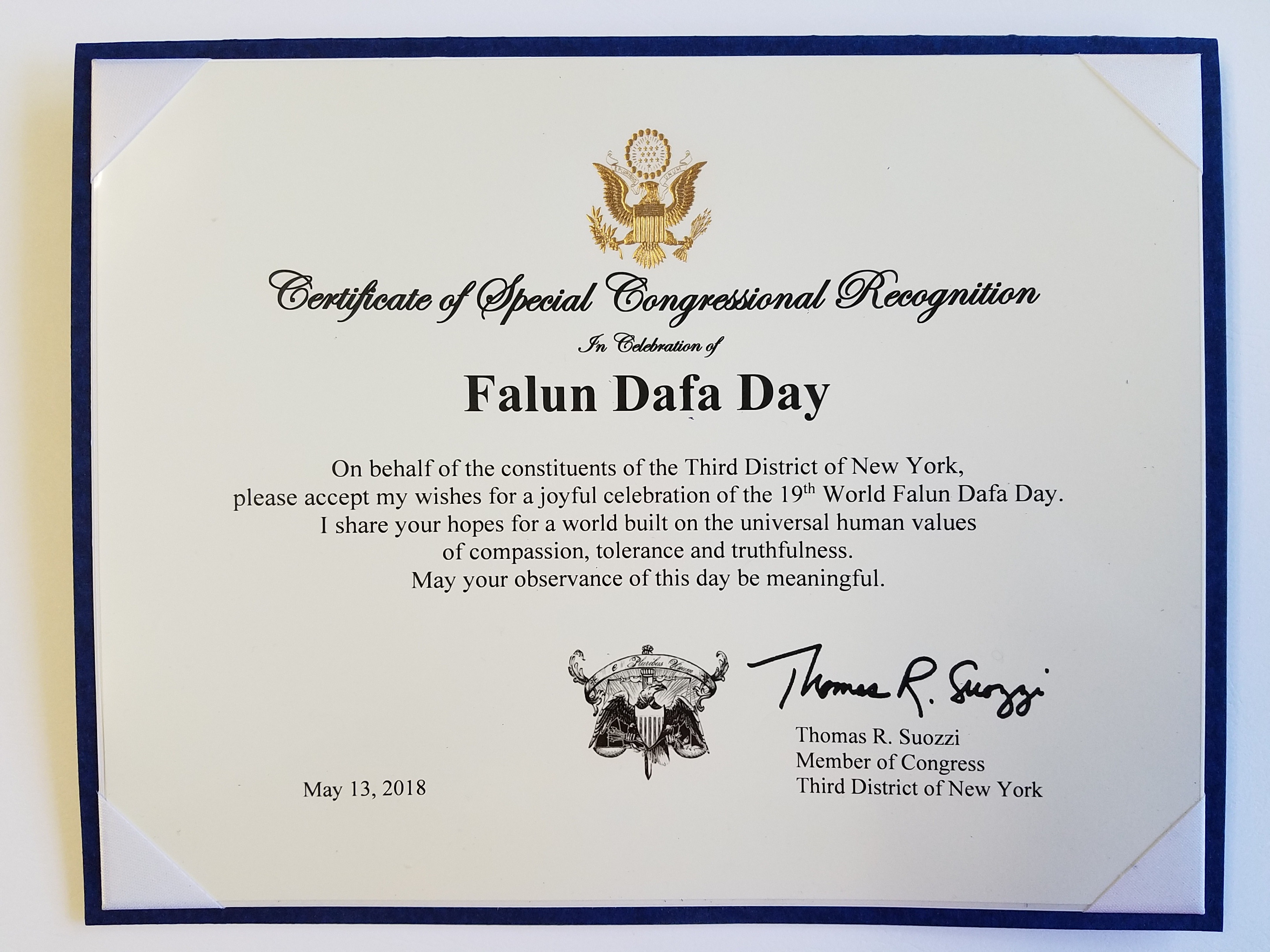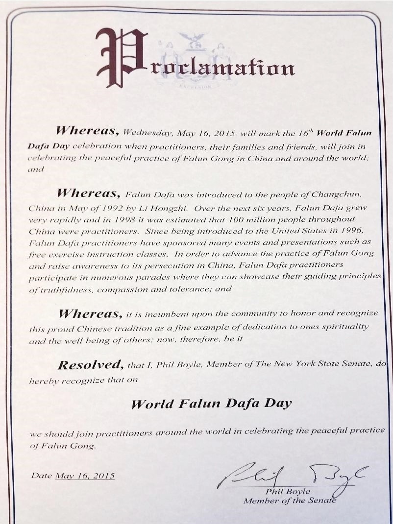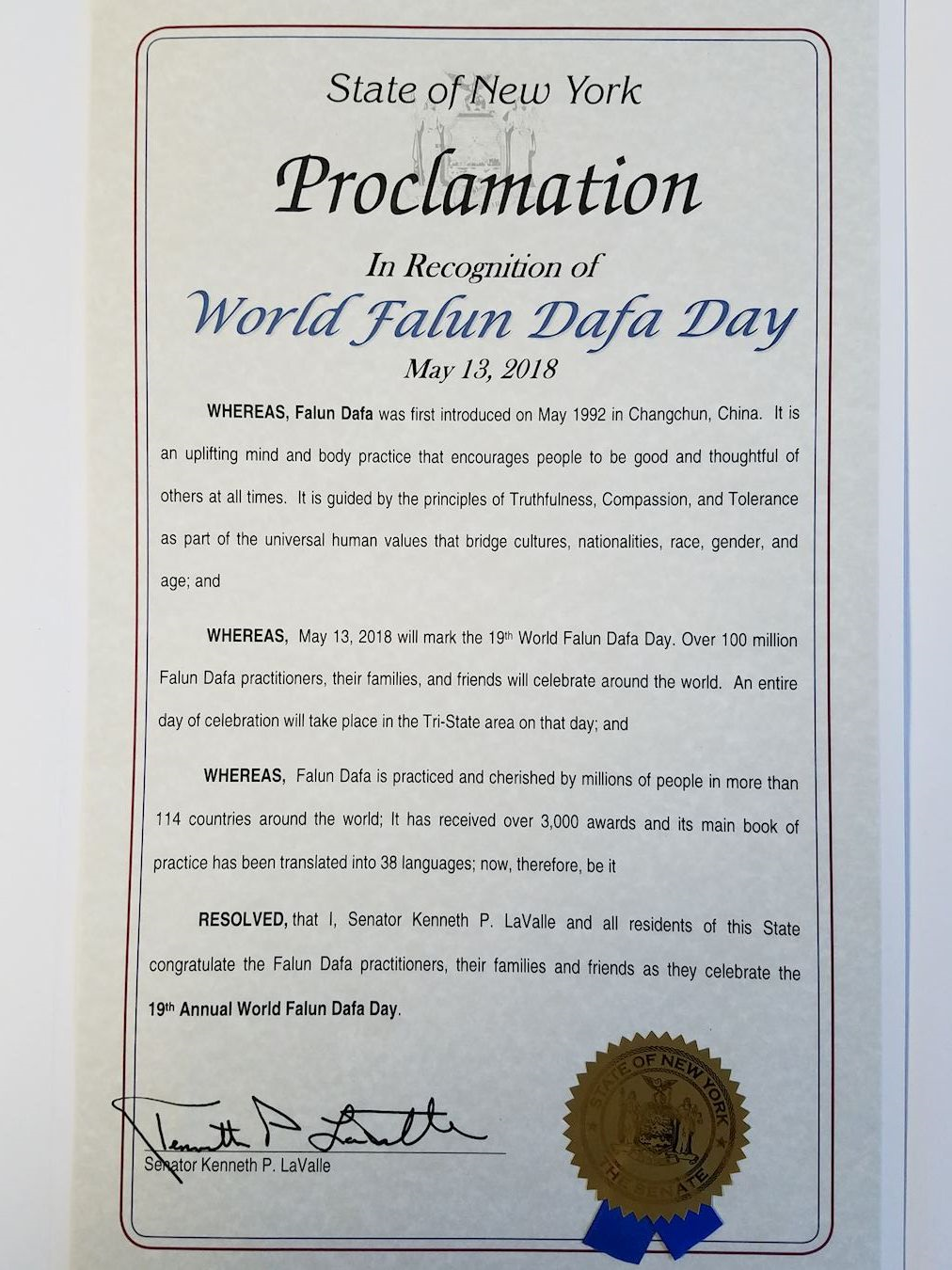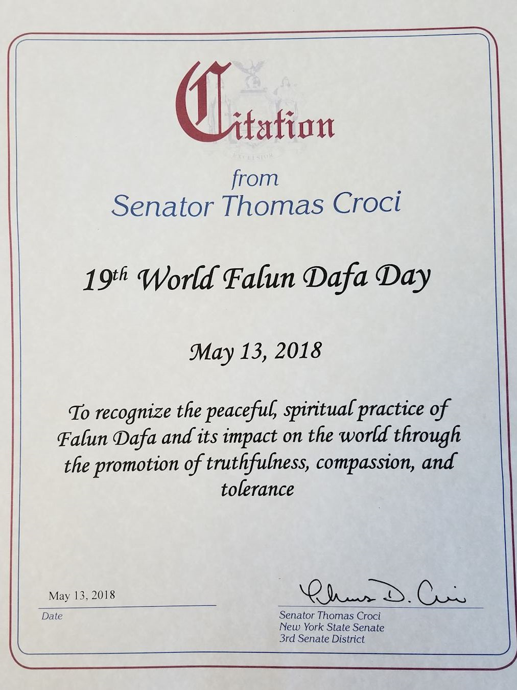 纽约州参议员克雷恭贺世界法轮大法日图为褒奖证书